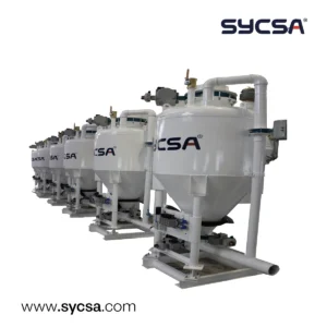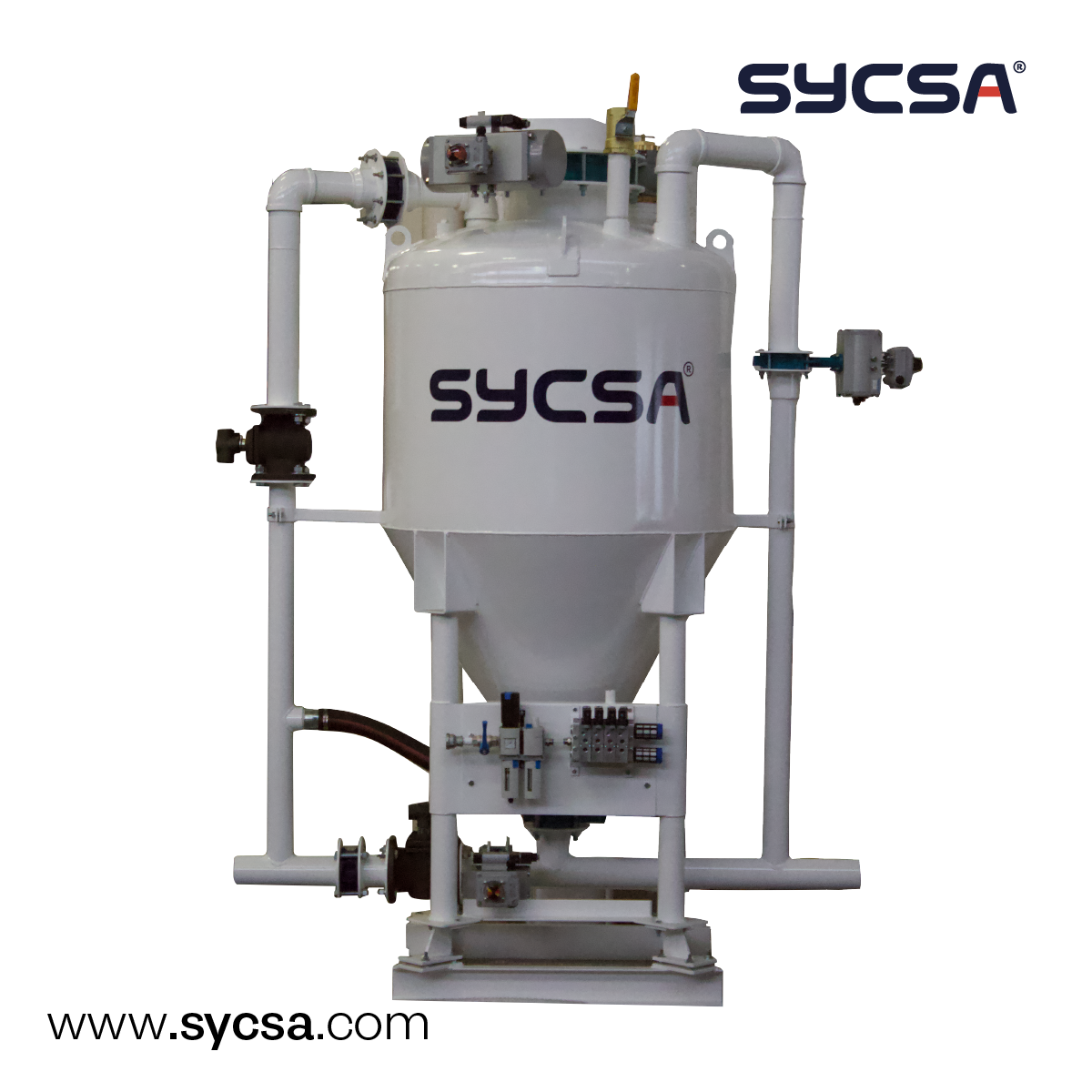 Es un equipo diseñado para trabajar a baja presión, que se puede cargar por vació (succión) o por gravedad, con cono de descarga a 60 grados con sistema de aireación (que utiliza el mismo motosoplador con el que se presuriza el equipo para airearlo), que cuenta con una o más válvulas de llenado, una válvula de descarga que alimenta a la línea de transporte neumático, una válvula de desfogue (para igualar presiones) , y una válvula de barrido de la línea de transporte neumático, todas ellas neumáticas, con sus electro válvulas adaptadas en un solo “block” de válvulas para facilitar su alimentación y control. Con una válvula de presurizado y una válvula de regulación de flujo de airea manuales que sirven para la puesta a punto del sistema, y una vez realizado esto se mantienen en esa misma posición.